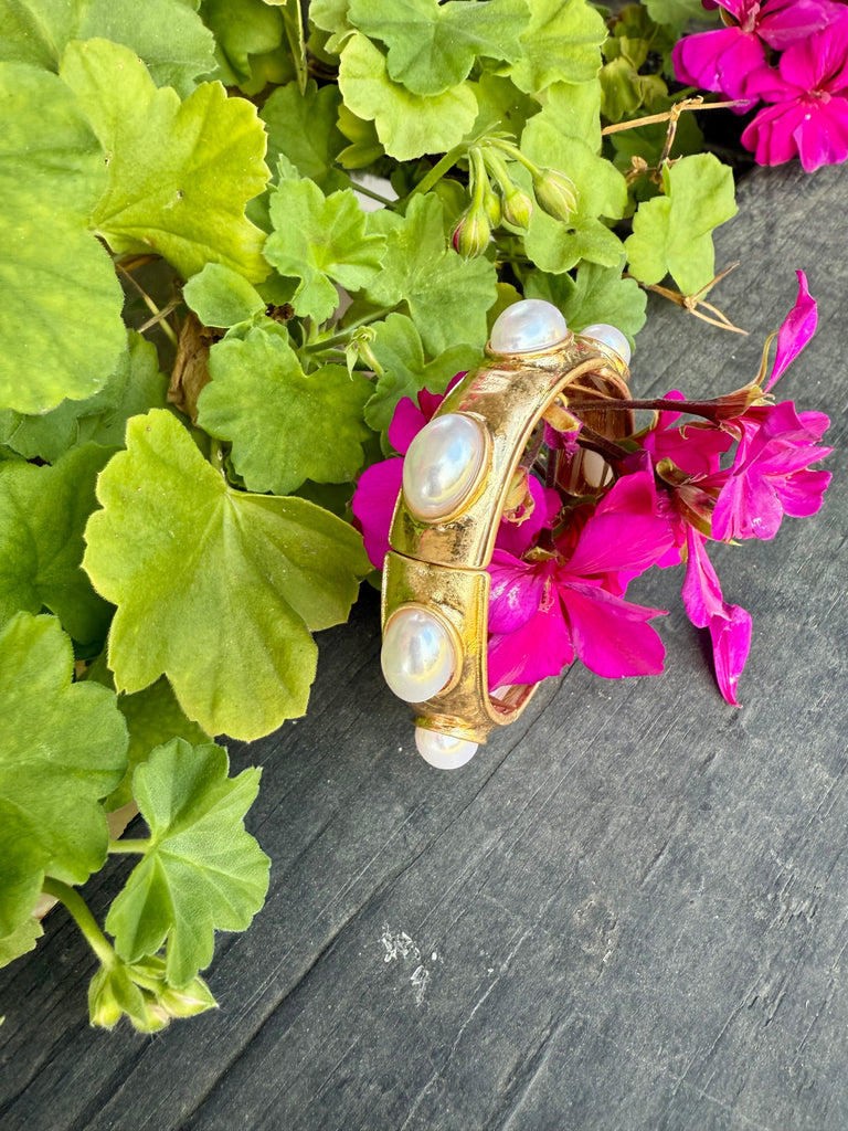 GOLD & PEARL BRACELET $21.00 / Default Title Out of stock Your Email Send This site is protected by hCaptcha and the hCaptcha Privacy Policy and Terms of Service apply. Hammered gold bracelet with oval pearls. Stretch.