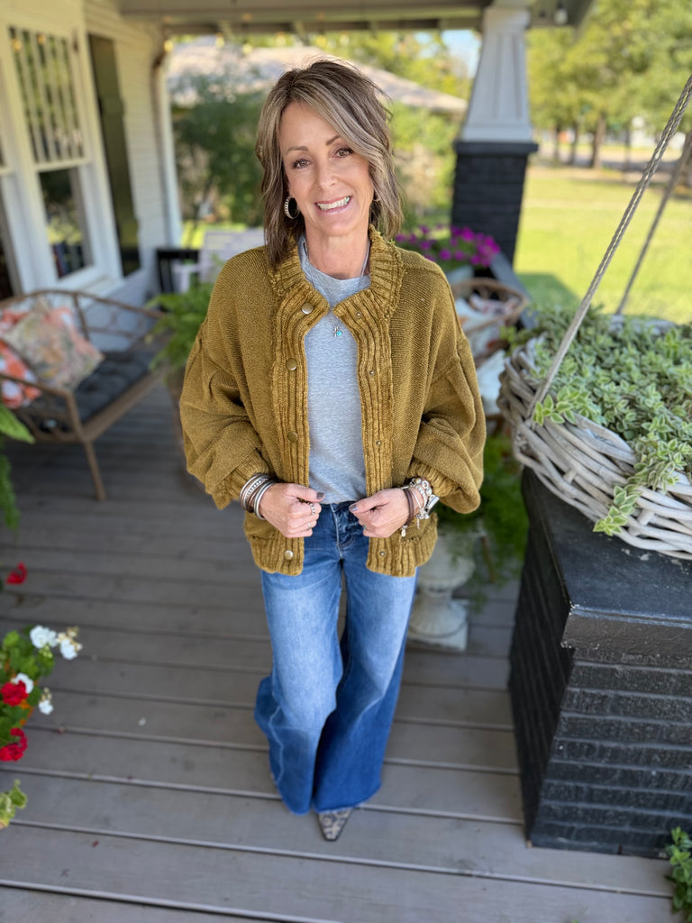 Cozy and classic, We the Free cardi. Features a soft terry fabrication. Drop-shoulder sleeves with cuffs. Patch pockets at front. Button-front closure. Ribbed knit trim. Defined seams. Relaxed fit.