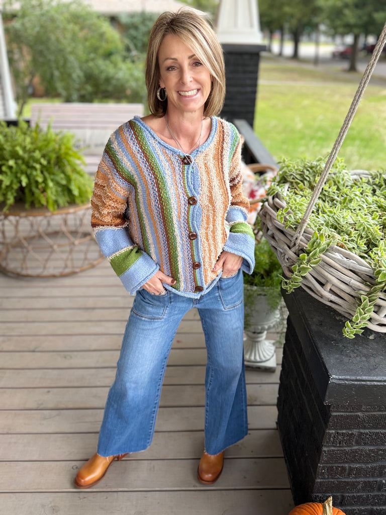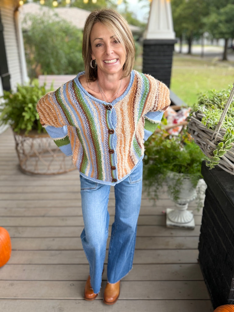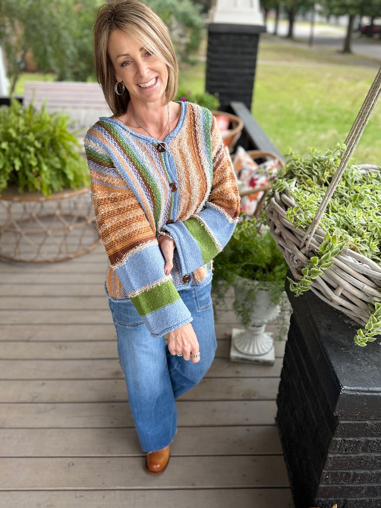 Multicolor boho-style cardigan. Vertical stripe pattern. Long flared sleeves. Button-down front closure. Raw edge seaming. Relaxed fit.