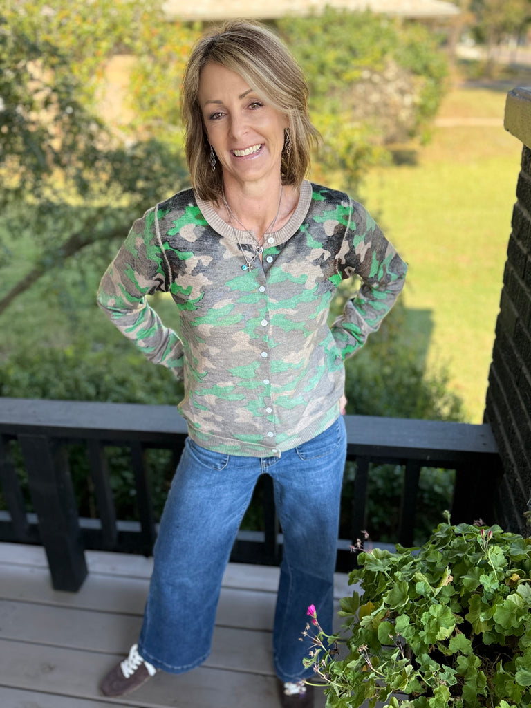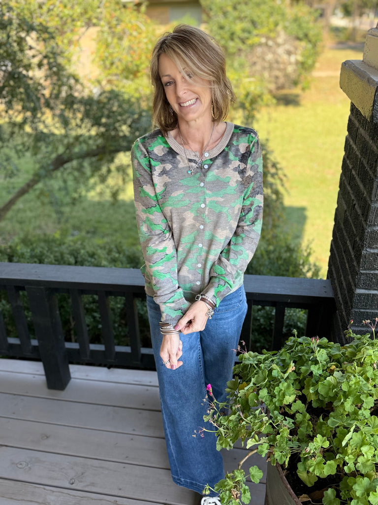 Faded camo knit cardigan. Round neckline. Long sleeves. Button-front closure. Ribbed hem.