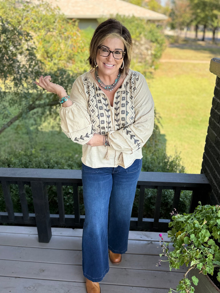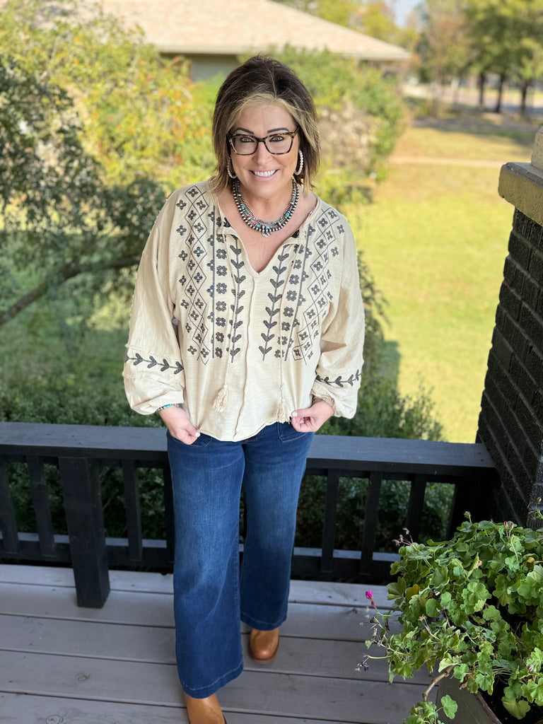 Embroidered detail top. V-neckline with tie. Long sleeves with elastic cuffs. High-low hem. Relaxed fit.